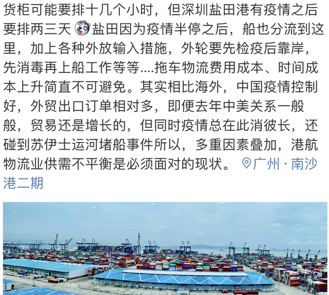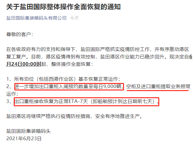 發布時間:2021-06-24鹽田港官方通知,自6月24日零時起整體操作全面恢復!(查看文章:重磅:鹽田港6月24日起全面恢復!船公司已做好重泊計劃,航線逐步恢復)南沙港卻宣布暫停出口辦單業務...