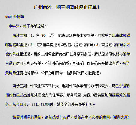 然而意外的是,6月23日上午,廣州南沙集裝箱碼頭發布緊急通知:從6月23日12:00時,暫停全部外貿出口辦單業務!